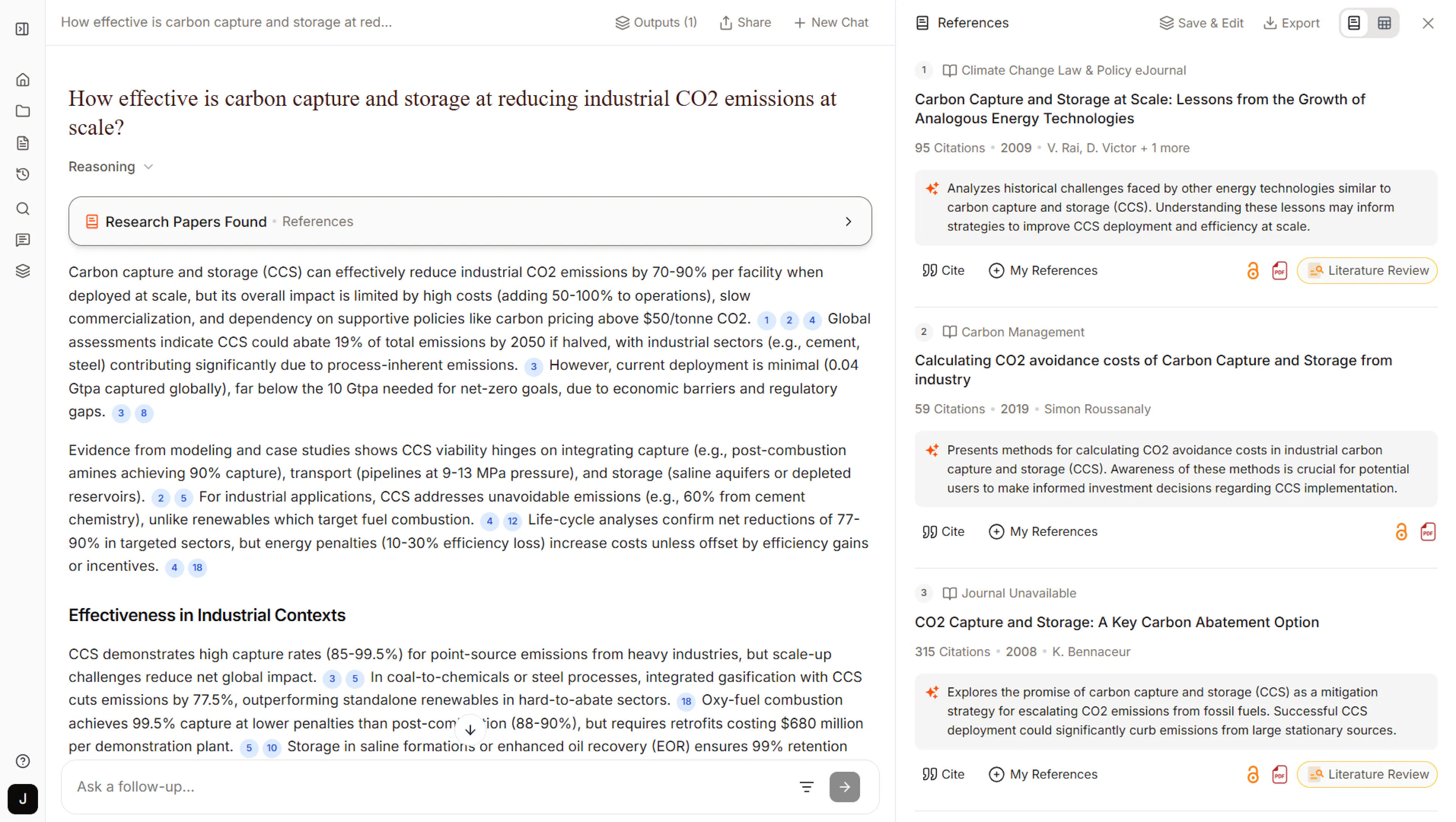 It supports flexible queries as a topic, research question, paper title, or plain-language description. After you get your initial results, you can ask follow-up questions in chat to refine or go deeper without starting over.