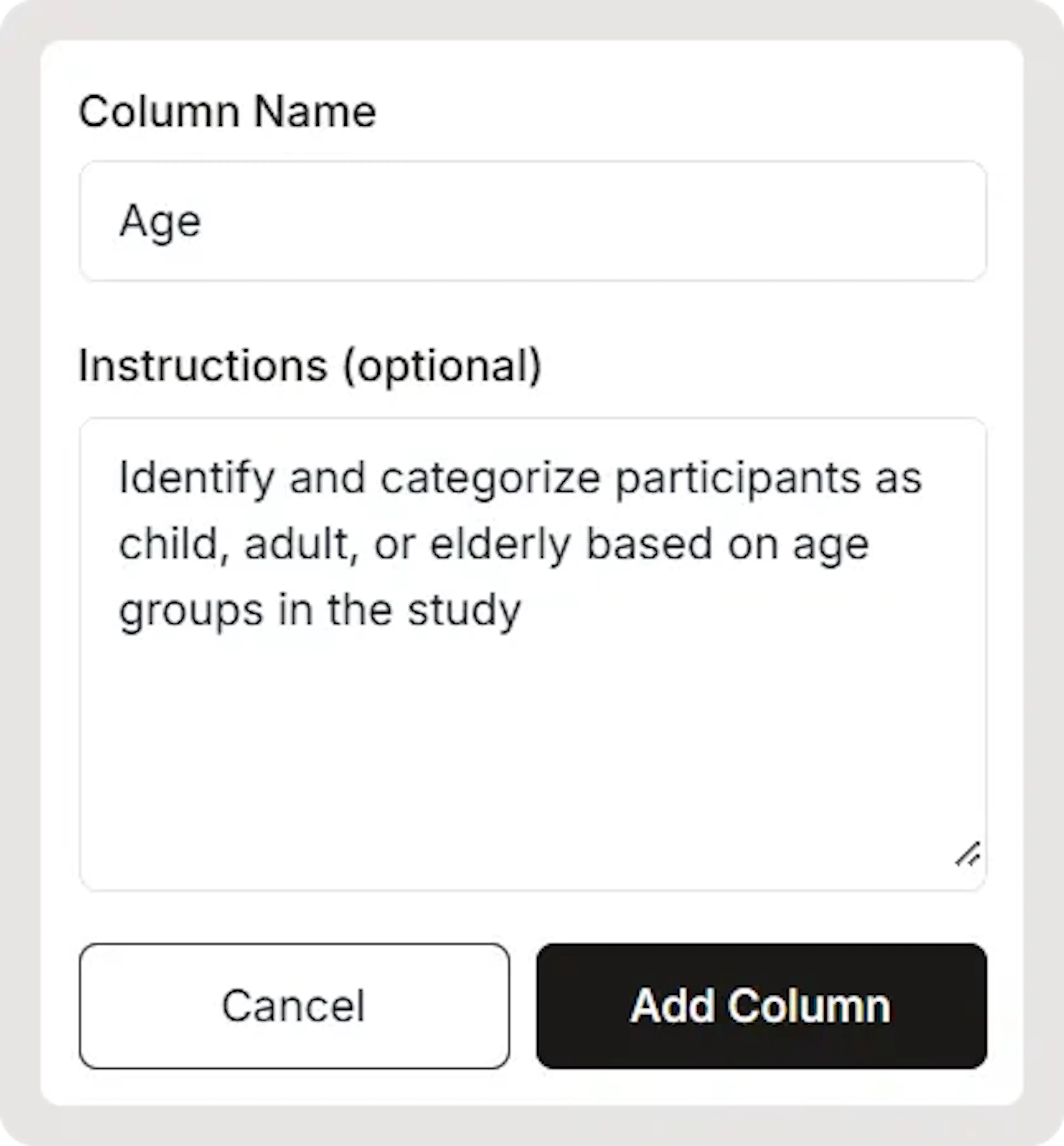 Click the Tab icon (top right) to open Manage Columns. Choose from 20+ predefined options (e.g., study outcome, demographics, methodology). Our AI extracts the exact data—no manual work needed!