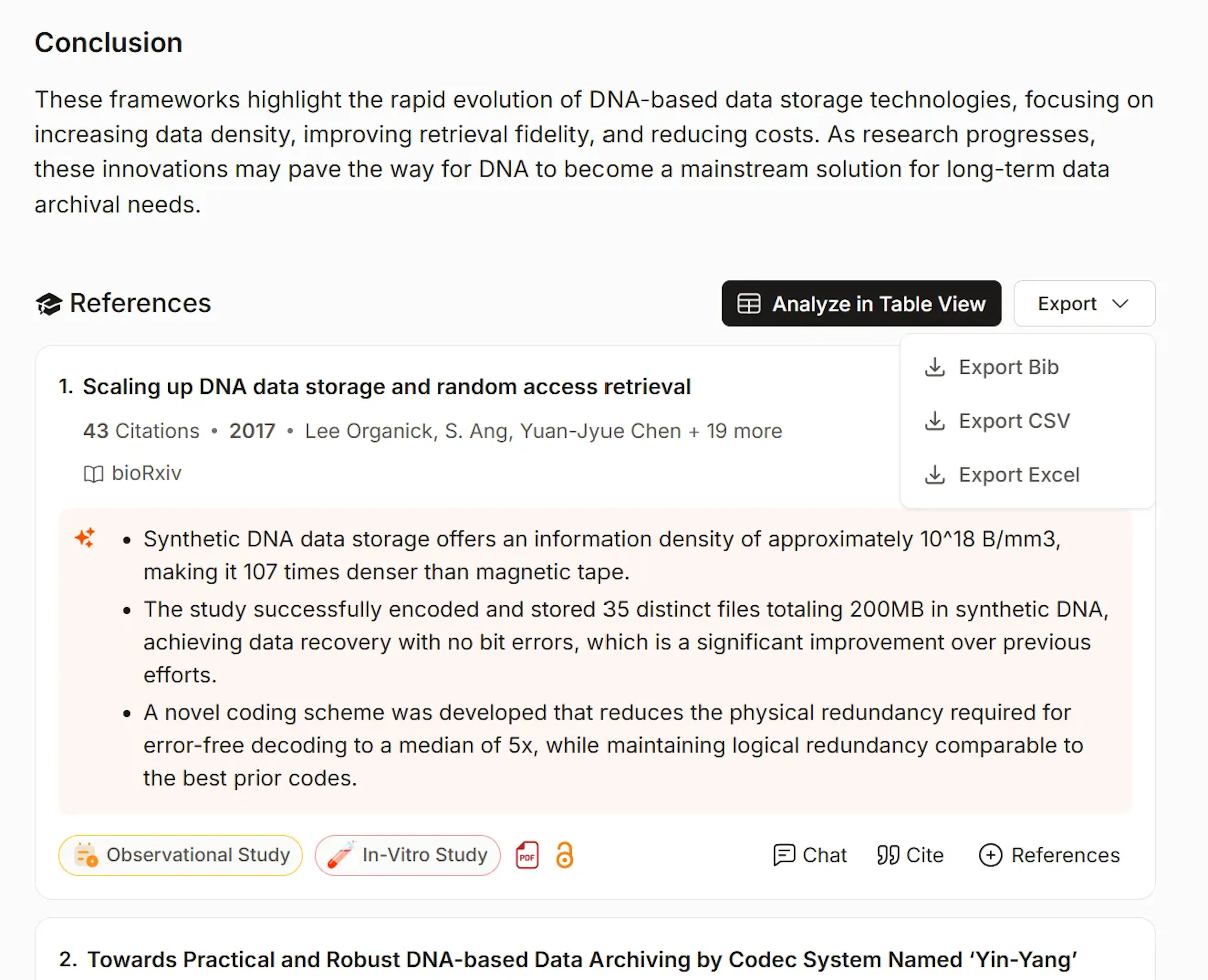 Download the references in bib, csv, and Excel formats. In CSV and Excel formats, you also get the insights from each paper in the Excel file.